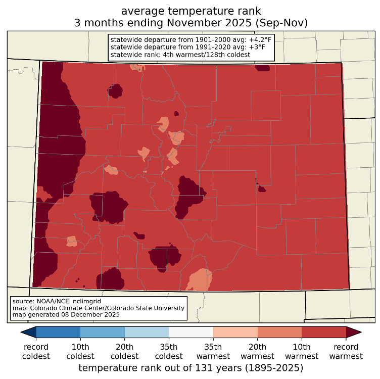 Above-normal temperatures have been a familiar story throughout autumn and early winter. Fall 2025 (September-November) was the 4th warmest on record, and much of that abnormal heat can be attributed to November (ranked the 3rd-warmest on record for Colorado according to NOAA NCEI). No areas of the state were spared from the unusually warm temperatures, but the heat was most notable along the West Slope, where some locations saw their warmest fall on record.