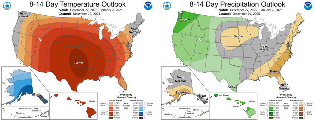 NOAA Climate Prediction Center Outlooks for temperature (left) and precipitation (right) for the next 8-14 days (December 27-January 2).