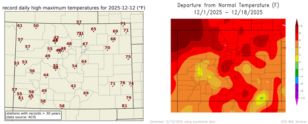 Left: Daily record high temperatures set on December 12. [Data from ACIS] Right: Departure from normal temperature for December 1-18, 2025. [Source: HPRCC]