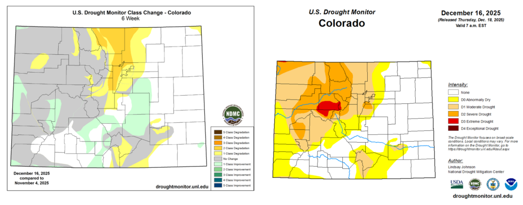 Left: U.S. Drought Monitor Change Map showing drought degradations (yellow/orange) and improvements (green) from November 4 to December 16. Right: U.S. Drought Monitor as of December 16, 2025. [Source: droughtmonitor.unl.edu]