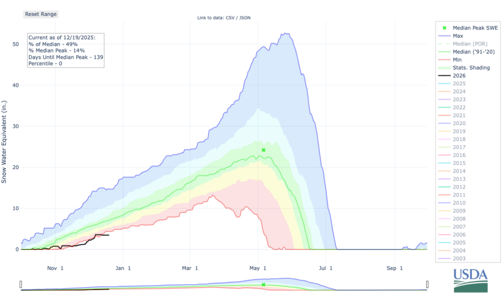 While basin-wide percentages are similar across the state, there are some particularly concerning numbers across the state’s northern basins. There, several SNOTEL stations are currently reporting their lowest or second-lowest snowpack on record. While it’s worth noting that several of these sites have relatively short record periods (~22 years) compared to others in the SNOTEL database, there are some stations with 40+ year records that are reporting record or near-record low values for this time in the winter. Even though a major portion of the snow accumulation is still ahead of us, with more dry weather in the forecast (more on that below), that is all bad news from a water perspective.