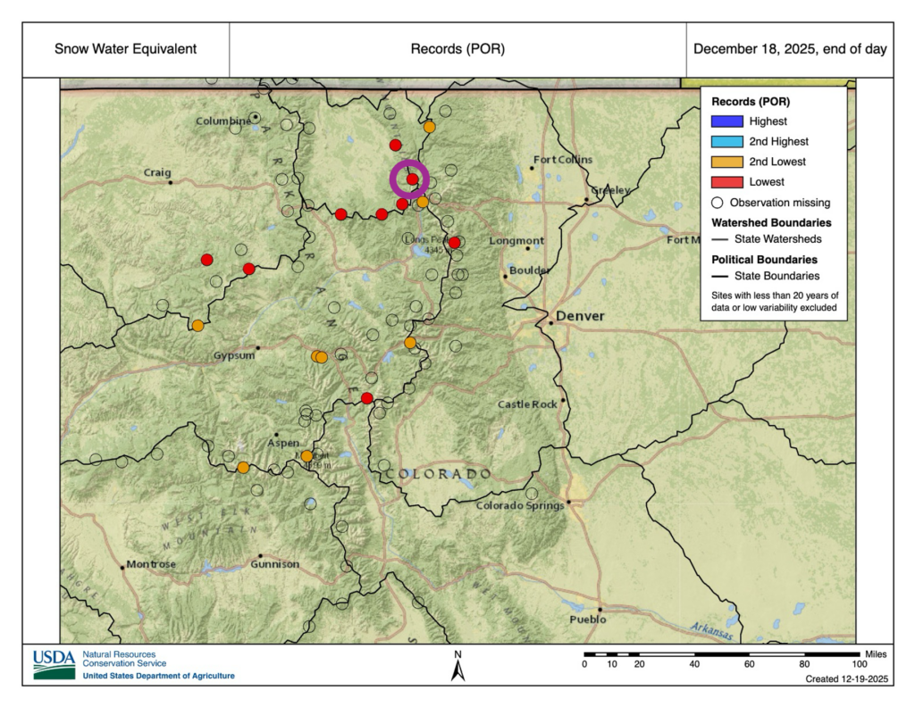 Image: SNOTEL stations reporting their lowest (red) or second-lowest (orange) period of record snow water equivalent (SWE). The station circled in purple is Joe Wright Reservoir, and a time series for SWE at that station is shown in the following image. [Source: NRCS]