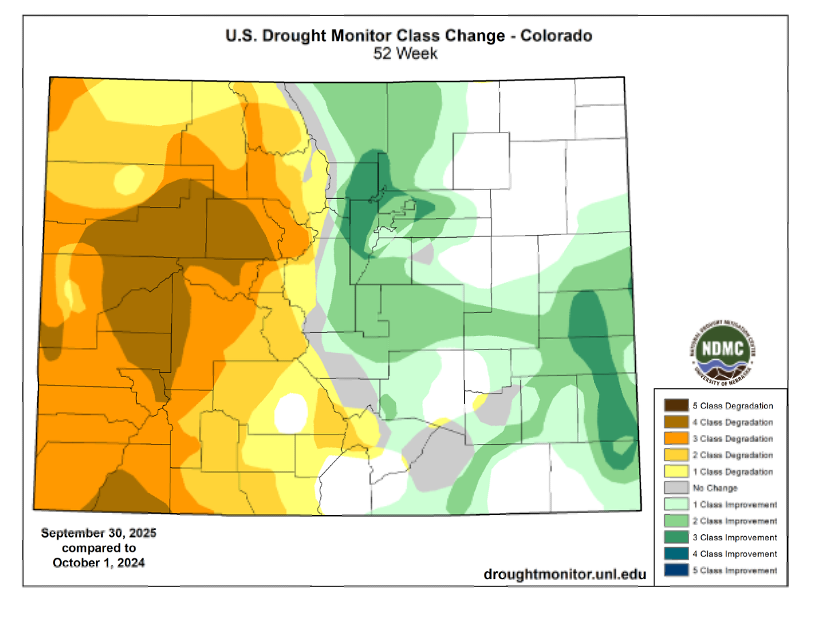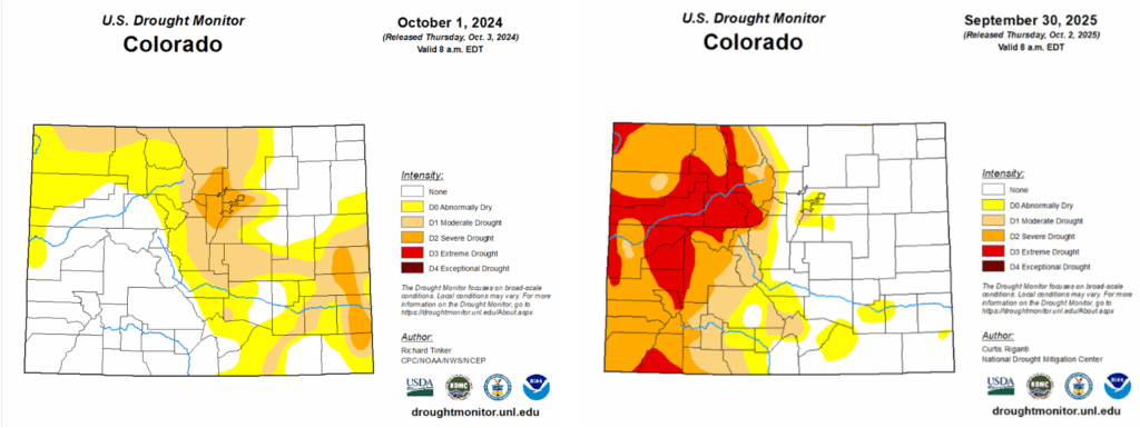The drought landscape changed substantially across Colorado during the 2025 Water Year. At the start of the water year, drought conditions were almost exclusively confined to eastern Colorado, where widespread moderate (D1) drought and pockets of severe (D2) drought were present. Areas west of the Continental Divide were nearly drought-free.