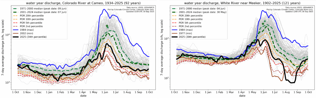 Below-normal snowpack led to low streamflow conditions for many locations in western Colorado. For one location along the Colorado River (Cameo, shown below), peak streamflow was only between the 10th to 20th percentile of the historical record (which is 92 years). Below-normal streamflow persisted across most of western Colorado throughout the summer, though some some rivers did see a boost in streamflow after noteworthy precipitation finally returned to that part of the state in late August through September (such as along the White River near Meeker, shown below).