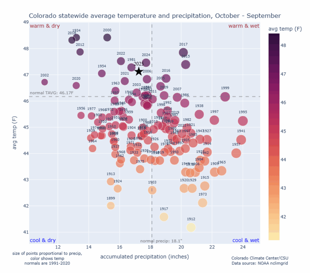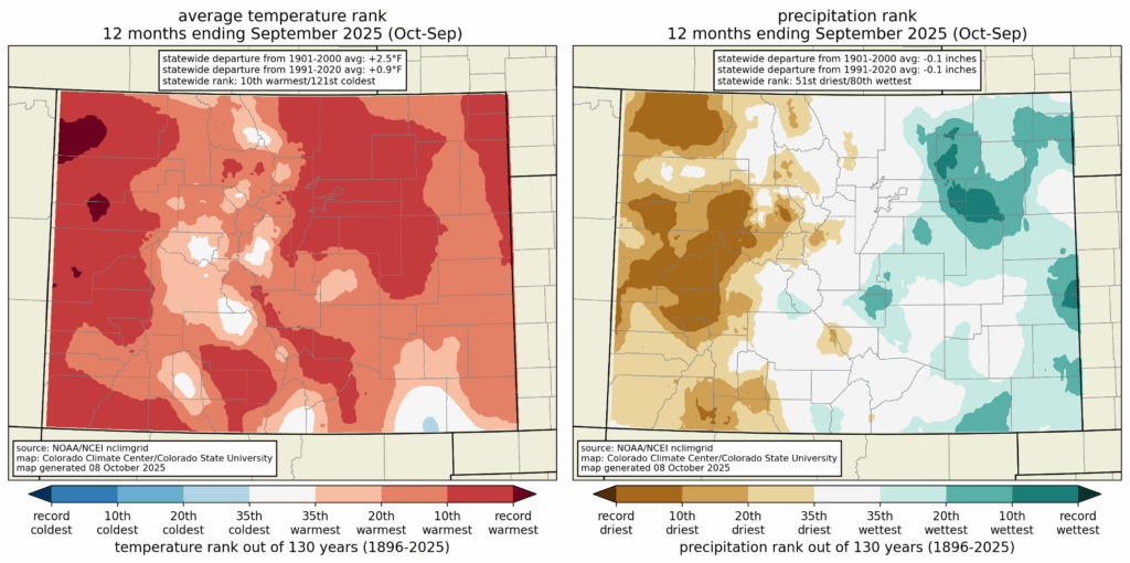 Conditions were also abnormally dry across Colorado during the water year, though the dryness was not as anomalous as the warmth. Water Year 2025 ranked as the 51st-driest on record, though conditions varied substantially across the state (more on that below).